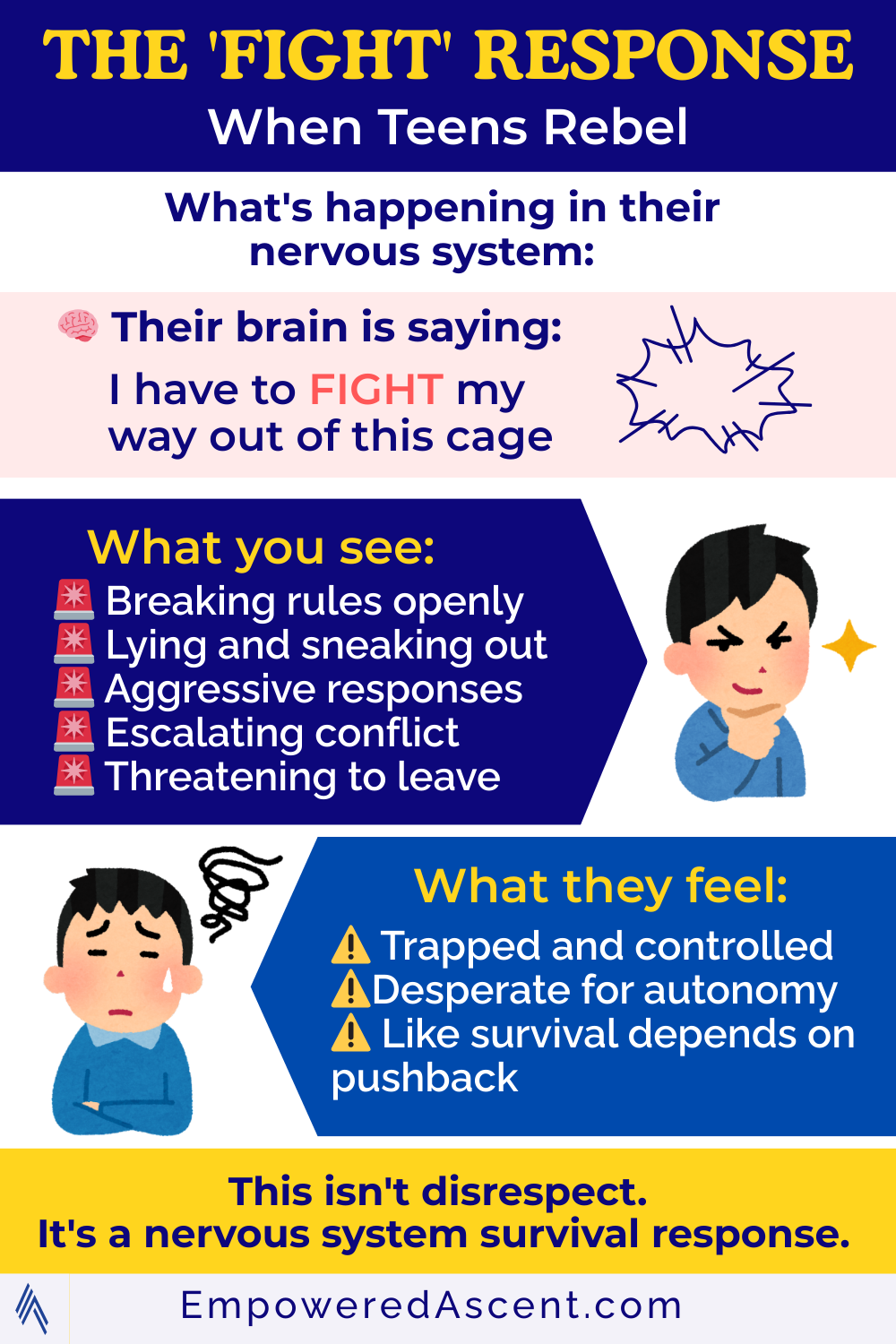 The body has three stress responses: fight, flight, or freeze. When your teen lives under constant pressure and control, their nervous system adapts to survive: