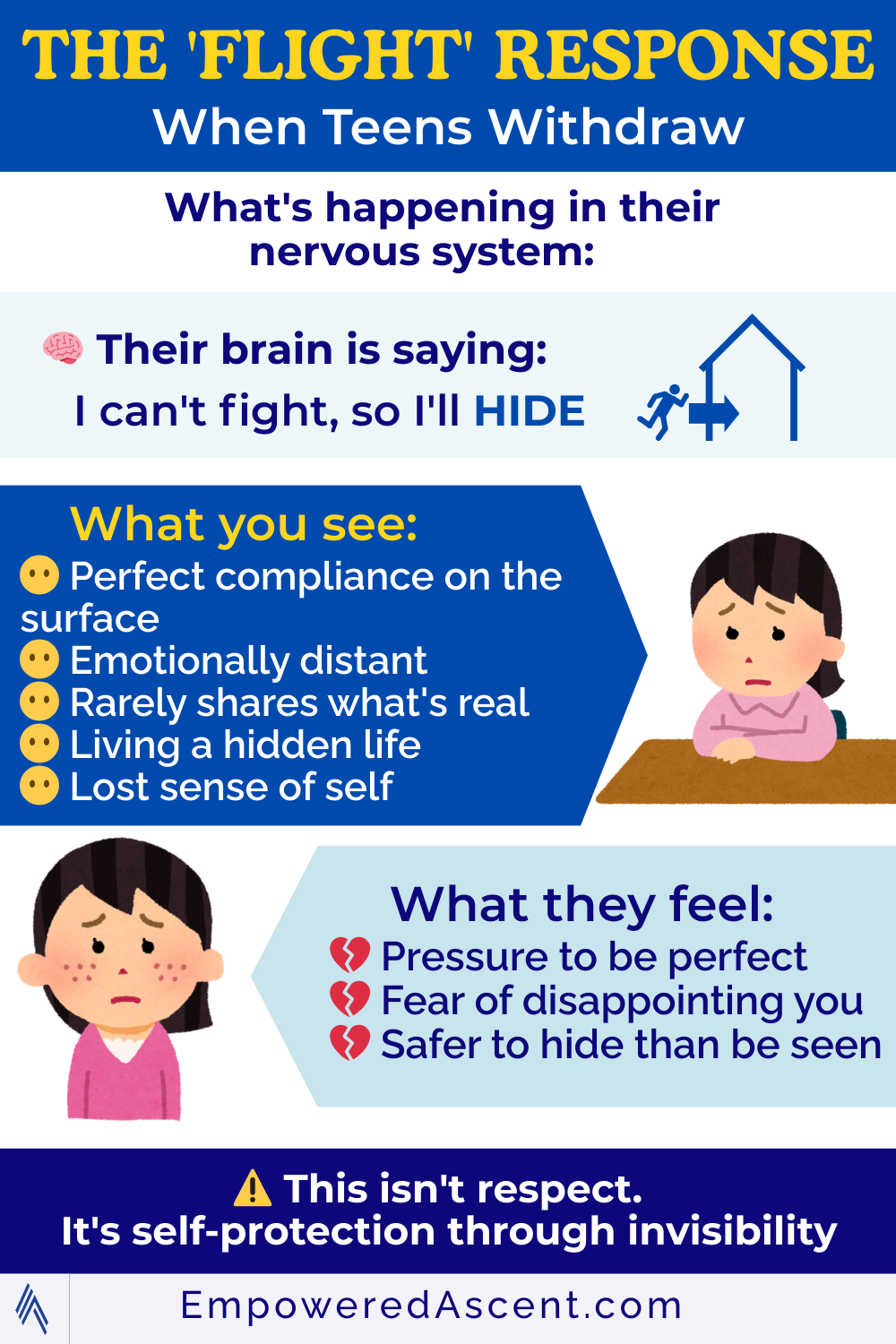 ⭕ Flight/Freeze (Withdrawal): More reserved, agreeable teens internalize everything. They comply outwardly but disappear inwardly - emotionally withdrawn, living a hidden life you don't see, losing their sense of self.